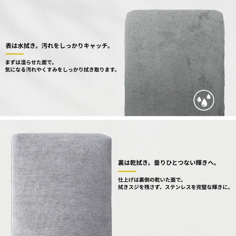 便利な両面設計を採用。湿らせた面で汚れを落とし、乾いた面で磨き上げるだけで、ピカピカの輝きが蘇ります。